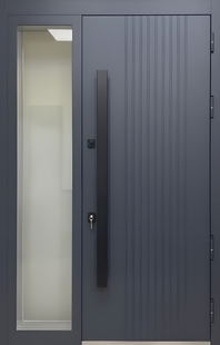 Входная термодверь с остекленной боковой вставкой, бугельной ручкой и серыми панелями МДФ антрацит — это надёжная защита и эстетика в одном решении. МДФ-панели не выгорают на солнце и устойчивы к царапинам. Подчёркивают контраст или плавность перехода между материалами. Отделка дополняет экстерьер и подчёркивает статус владельца.